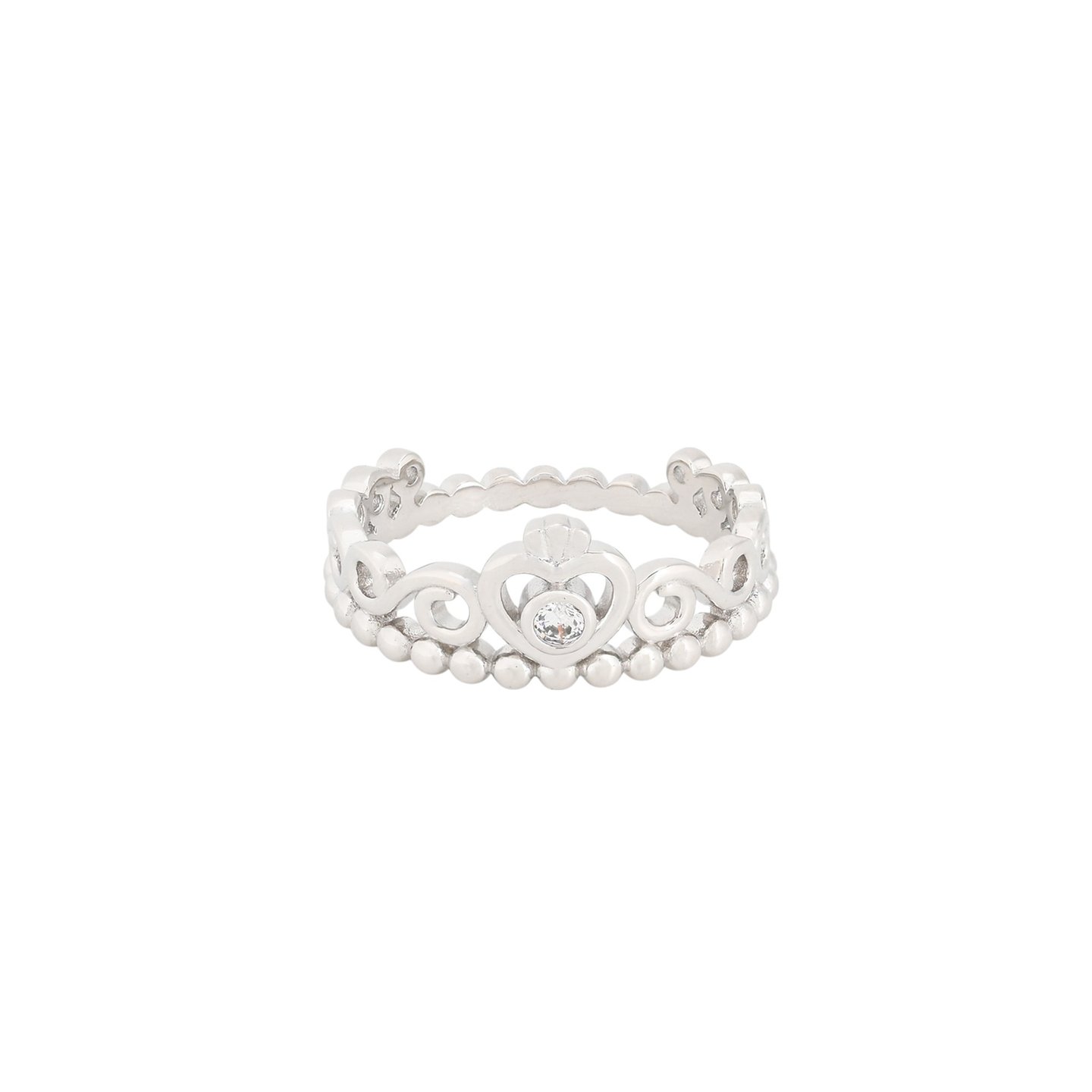 Anel delicado em aço inoxidável, com design em forma de pequena tiara e detalhe de coração central com zircórnia.