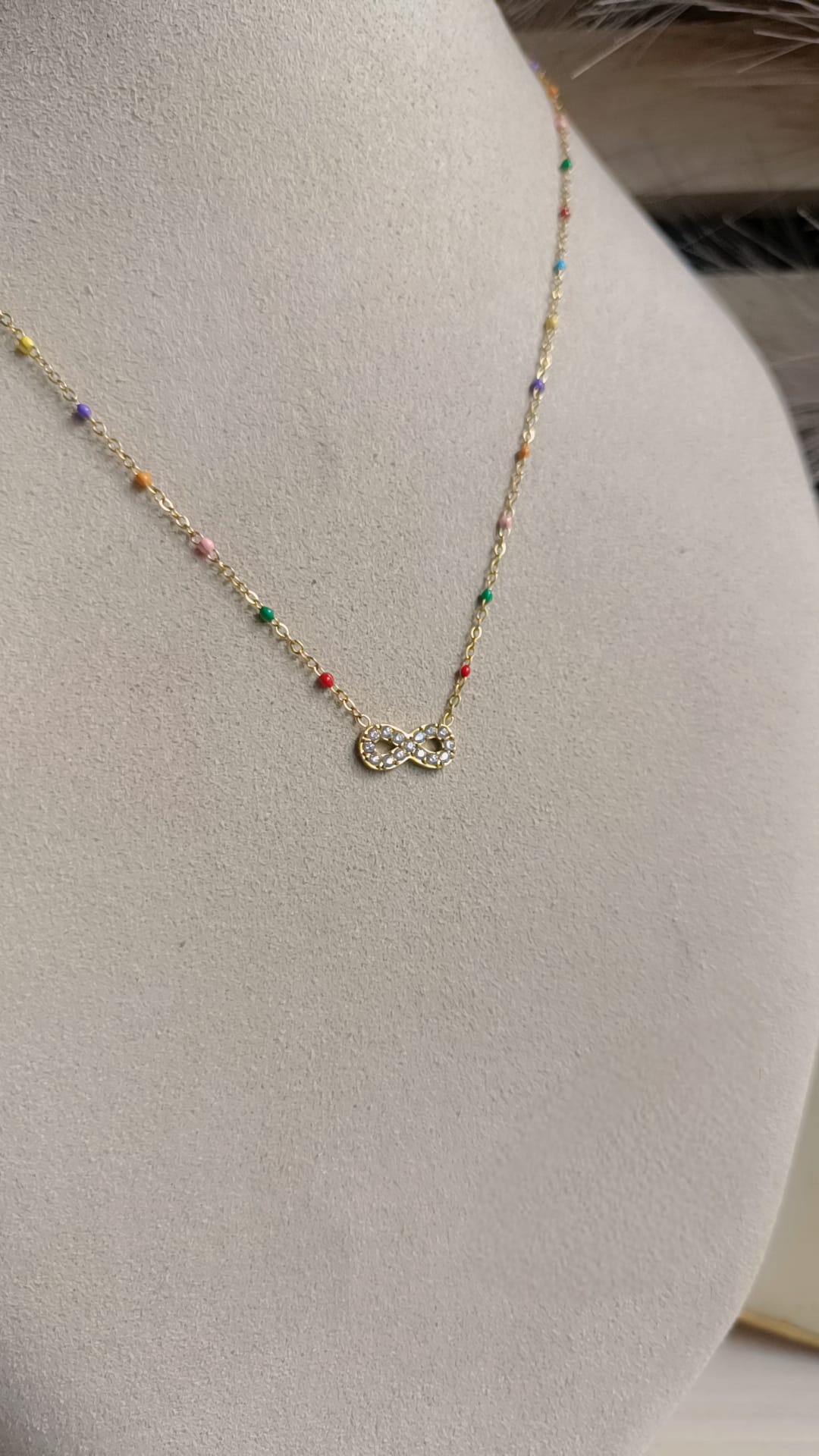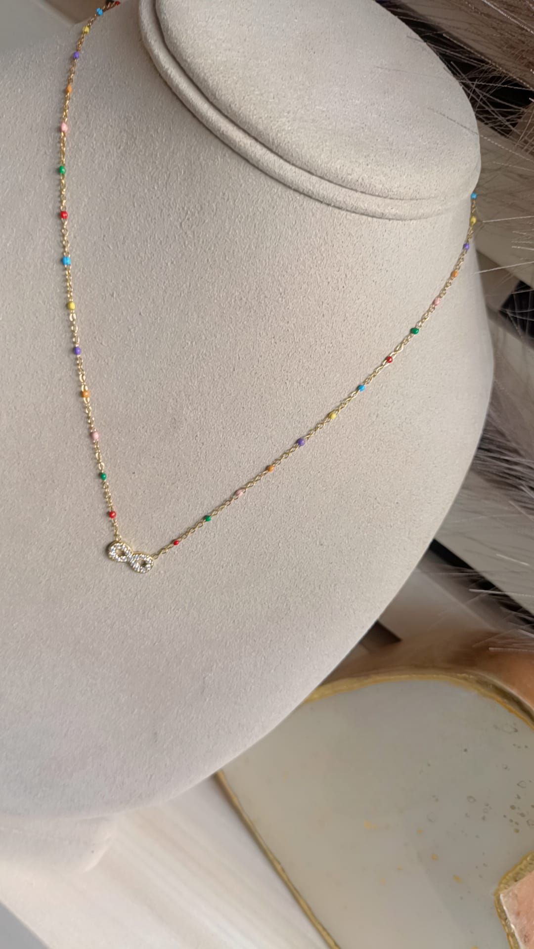 Colar delicado em aço inoxidável dourado com corrente multicolor, trazendo um toque alegre e feminino ao look.