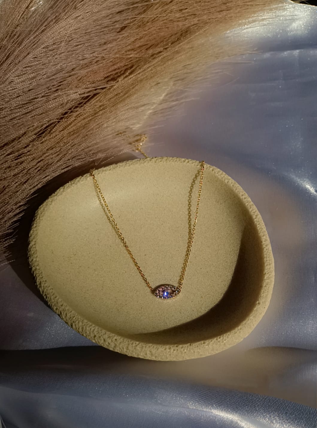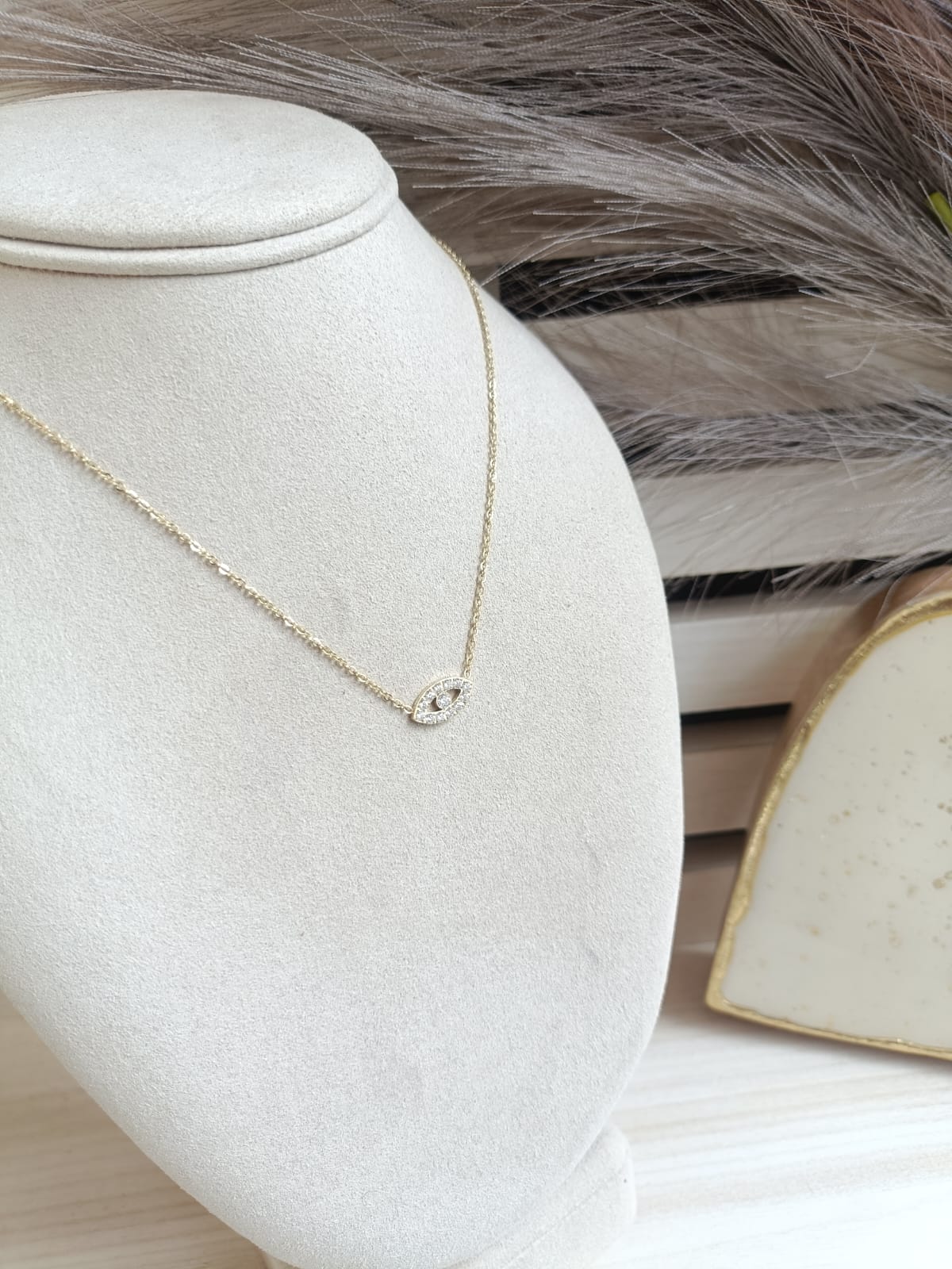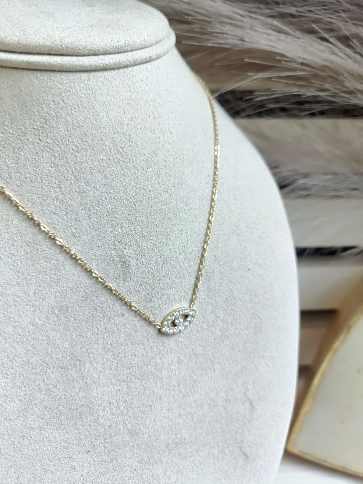 Colar delicado em aço inoxidável dourado com pendente em forma de olho, cravejado com zircônias para um toque luminoso e elegante.