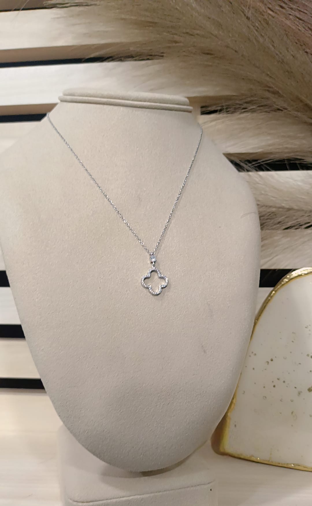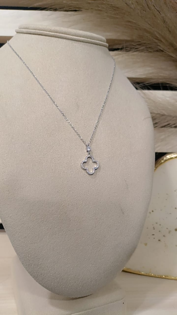 Colar delicado em aço inoxidável prateado, com pendente em forma de quatro pétalas cravejadas, criando um brilho elegante e subtil.