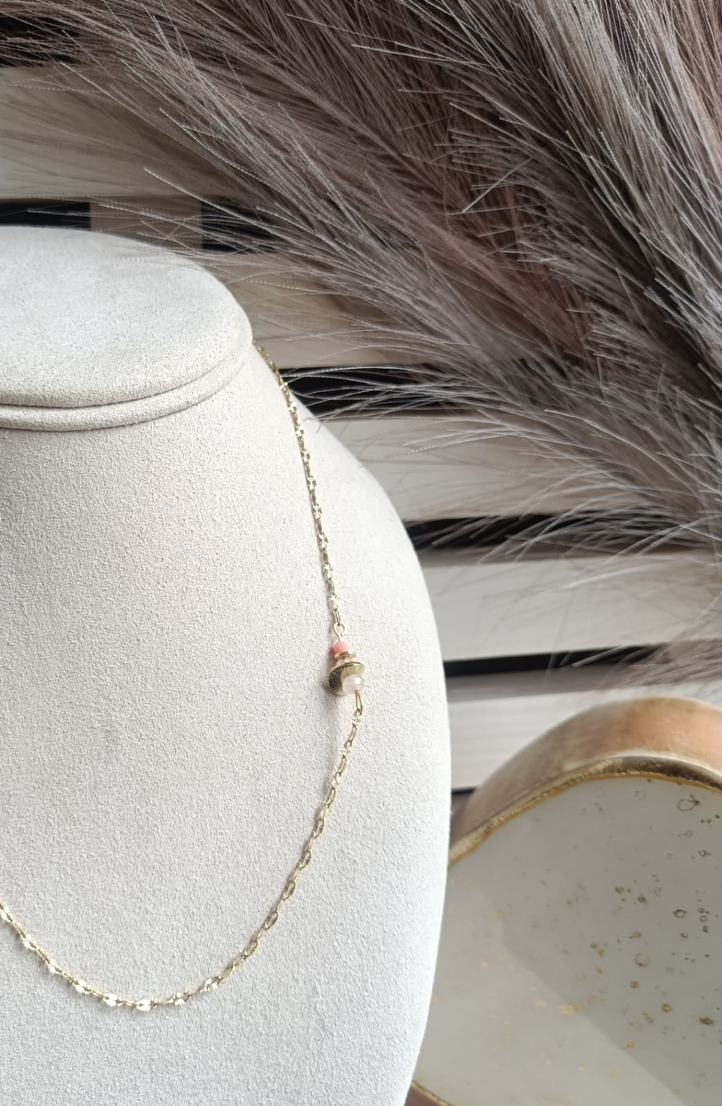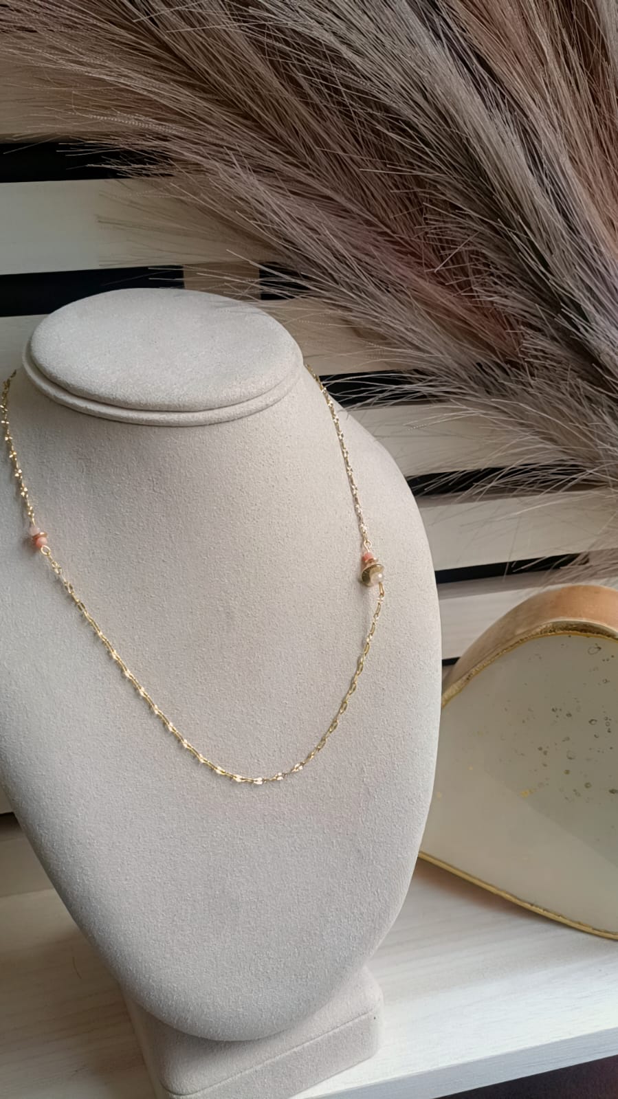 Colar delicado em aço inoxidável dourado, com corrente trabalhada e pequenos detalhes em contas rosa que acrescentam suavidade e feminilidade à peça.